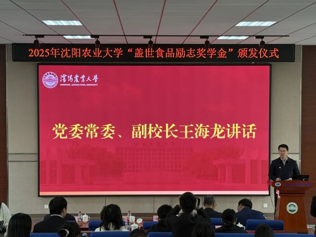 土壤楼A座226报告厅隆重举行。盖世食品股份有限公司副总经理荆英,校党委常委、副校长王海龙,党委学生工作部(学生处)部(处)长宋德群,财务管理中心副主任李丙秋,学生处副处长蹇东伟,学生处学生资助中心负责人以及相关学院负责人、辅导员及获奖学生代表出席仪式,大会由党委学生工作部部长宋德群主持。