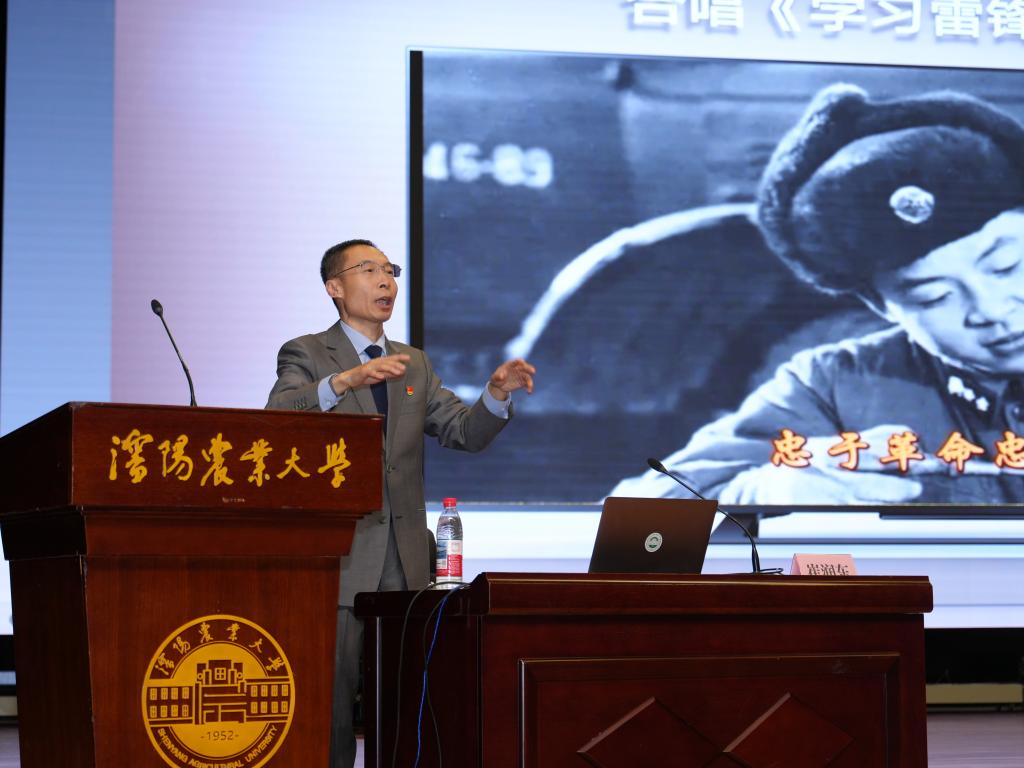 崔润东教授以《英雄永不谢幕,雷锋精神代代相传》为题,围绕“雷锋,我们怀念你”“雷锋,我们学习你”“雷锋,我们成为你”三大篇章,创新运用“音乐+事迹+影像”沉浸式形式,将经典旋律与感人故事深度融合,深刻阐释雷锋精神的时代内涵与价值。报告生动讲述了金城龙同志忠诚担当、无私奉献、一心为民的先进事迹,现场带领全体师生齐唱《学习雷锋好榜样》,为在场师生献上一堂直击心灵、催人奋进的思政课、信仰课、成长课。报告结束后,学生代表主动上台献花,向老师致以诚挚敬意。